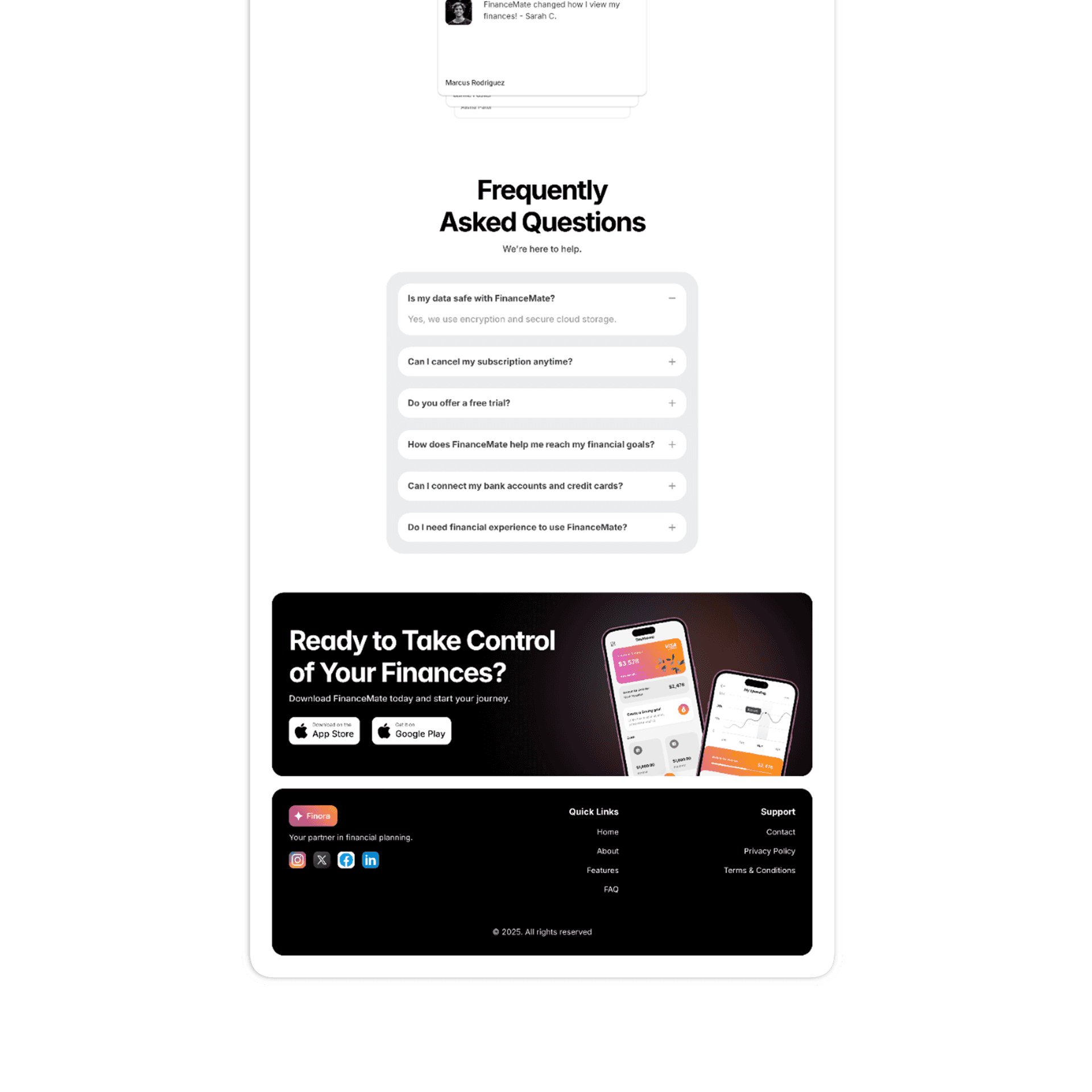 Finora delivers a cohesive and user-friendly financial planning experience across both product and marketing touchpoints. The final design successfully positions the app as a modern, accessible solution for managing personal finances while maintaining clarity, trust, and ease of use. This project showcases my ability to design end-to-end product experiences—from app interfaces to high-conversion landing pages—using Figma and Framer.