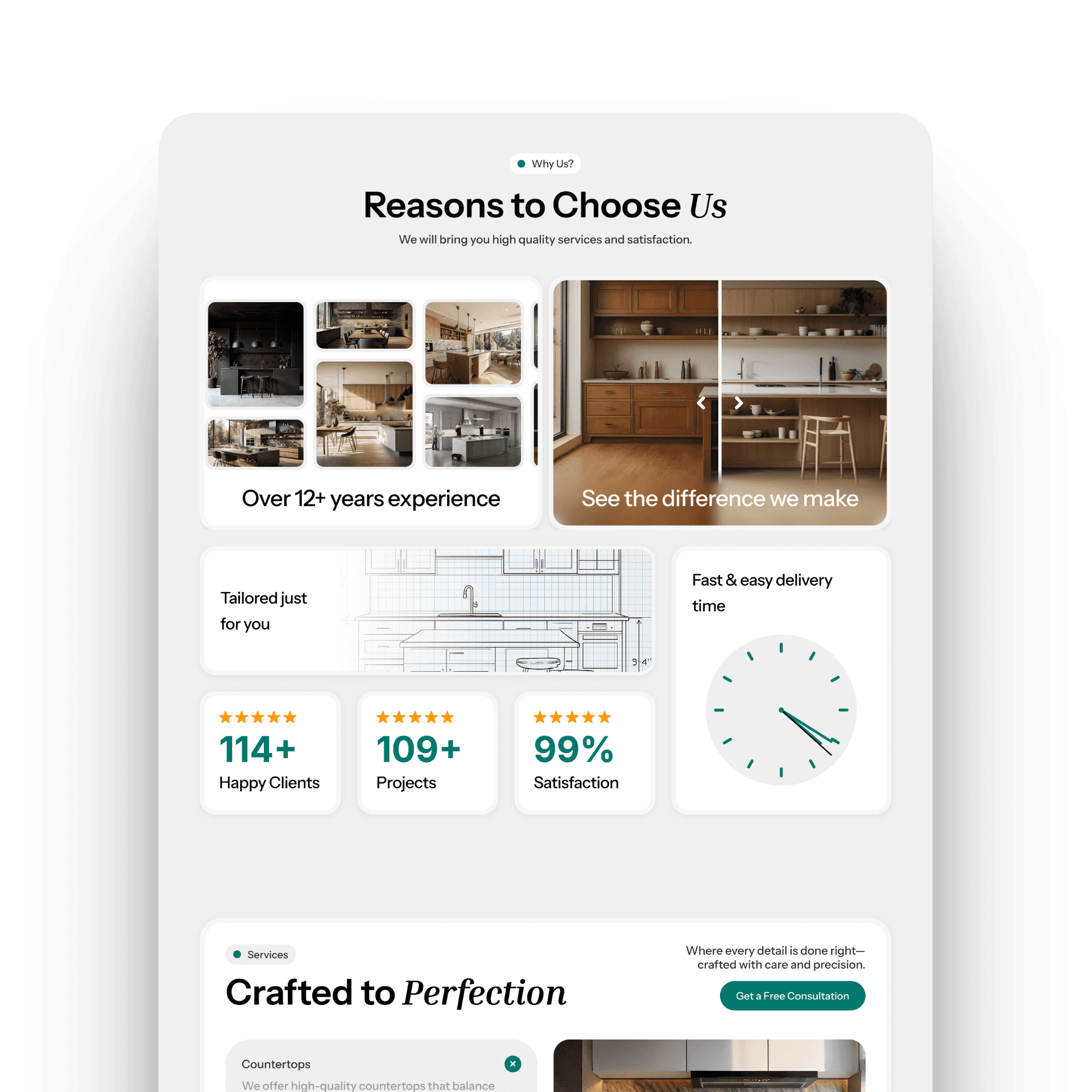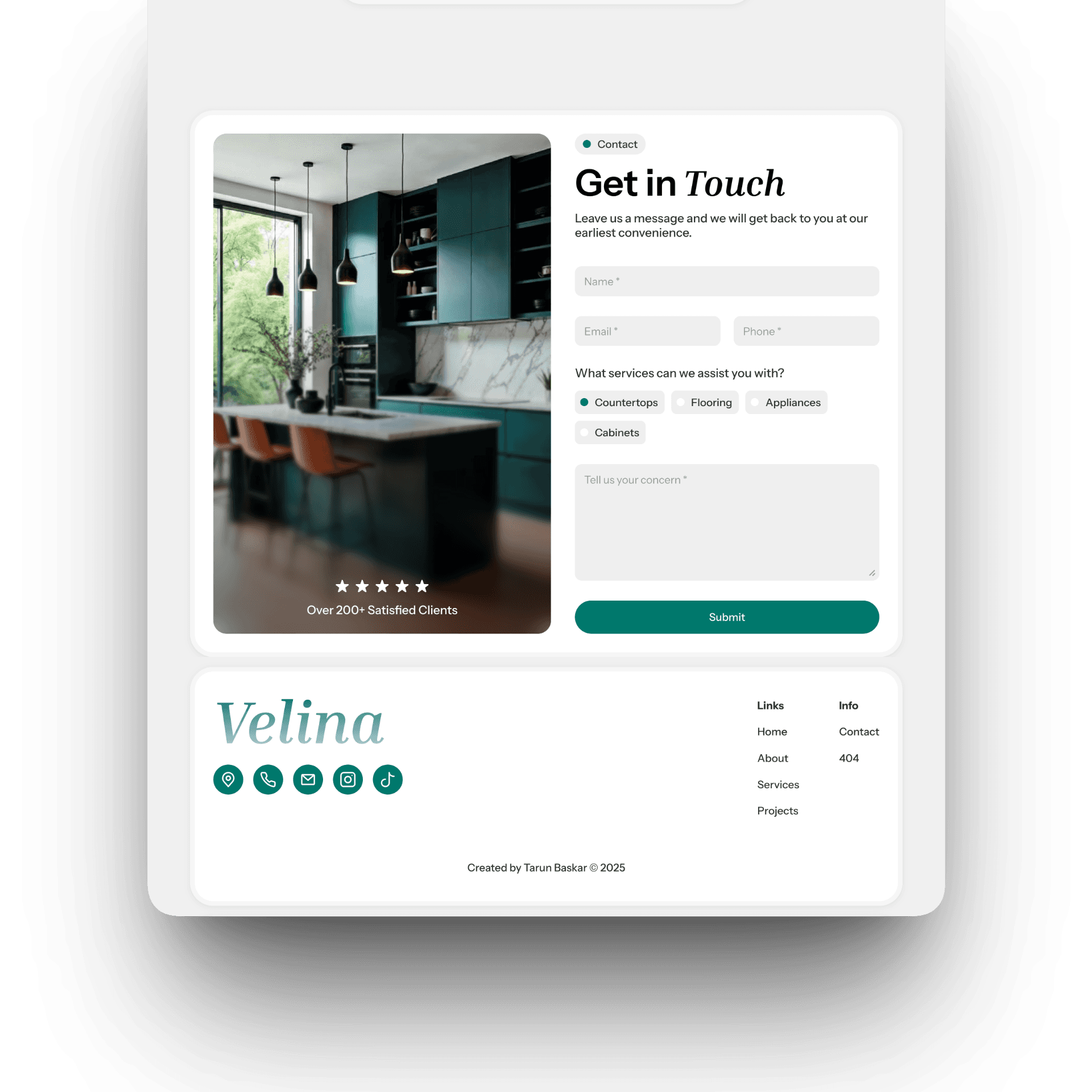 Velina is a modern kitchen remodeling website designed to help homeowners explore design possibilities, understand services, and confidently take the next step toward renovation. The focus was on creating a clean, elegant experience that reflects craftsmanship, trust, and premium quality while guiding users toward inquiries and consultations.
